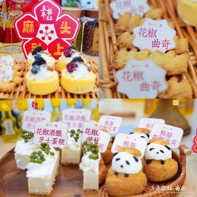 五丰黎红细心预备的花椒酒酿芝士蛋糕、熊猫花椒泡芙、花椒曲奇、花椒巧克力费南雪等甜品,以及花椒柠檬水、花椒生果茶等饮品,打破了花椒仅用于菜肴的保守认知。